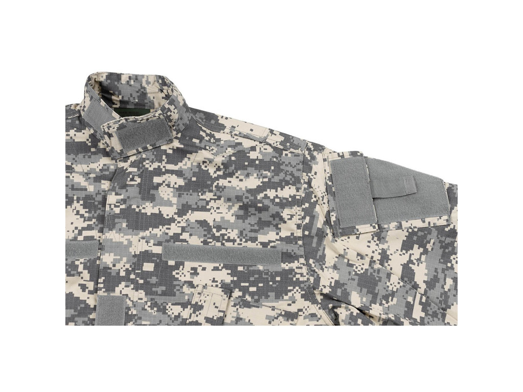 Polní blůza ACU (Army Combat Uniform) vychází z modelu, který v minulosti sloužil jako základní uniforma americké armády pro všechny typy nasazení. Je vyrobena z kvalitního materiálu Rip Stop, který lépe odolá proti roztržení. Blůza disponuje dvěma šikmo našitými náprsními kapsami s boční klopou a zapínáním na suchý zip. Dále má dvě skládané ramenní kapsy s patkou a suchým zipem, které jsou navíc vybaveny suchými zipy pro snadné připevnění nášivek. Na loktech jsou umístěny dvě speciální kapsy se suchým zipem, určené pro vložení volitelných chráničů loktů pro zvýšenou ochranu. Blůza je vybavena skrytým dvoucestným předním zipem s krycí légou na suchý zip, což zajišťuje spolehlivé a diskrétní zapínání. Stojáček s regulací šířky na suchý zip umožňuje individuální přizpůsobení. Dva záhyby na zádech pak poskytují větší volnost pohybu. Na hrudi jsou umístěny tři suché zipy, které slouží k připevnění jmenovek, hodností a dalších identifikačních nášivek. Manžety rukávů jsou nastavitelné na šířku pomocí suchého zipu.