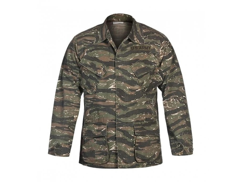 Tato blůza je replikou střihu BDU (Battle Dress Uniform) nebo spíše tropické combat uniformy, která se v té době používala. Tento střih se vyznačoval zešikmenými kapsami na hrudi, což usnadňovalo přístup k obsahu i při nošení taktické vesty. Maskovací vzor Tiger Stripes se vyznačuje úzkými, nepravidelnými pruhy, které připomínají tygří srst. Obvykle kombinuje barvy jako zelená, hnědá a černá na světlejším olivovém nebo khaki podkladu. Ačkoli je vzor neodmyslitelně spojen s válkou ve Vietnamu, nebyl nikdy oficiálně standardizován pro celou US armádu. Byl vyvinut pro jihovietnamské ozbrojené síly a později se stal velmi oblíbeným mezi americkými speciálními jednotkami (např. Navy SEALs nebo Zelené barety), protože skvěle maskoval v husté džungli.