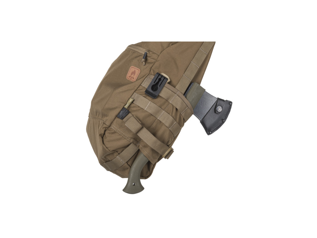 Velmi praktické je řešení vnějších boků tašky. Kromě systému PALS umožňujícímu připevnění sumek s MOLLE vazbou nabízí také stahovací popruh umožňující stažení tašky, případně fixaci zavěšeného vybavení. Pod MOLLE panelem jsou dvě horizontální kapsy k nošení sekery a pilky.