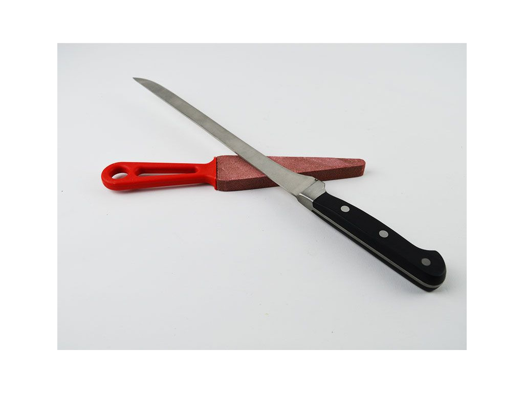 Klasický ruční brousek (brusný kámen) s plastovou rukojetí, určený pro základní údržbu ostří. Díky svému tvaru je vhodný pro hrubší broušení nožů a pracovních nástrojů.