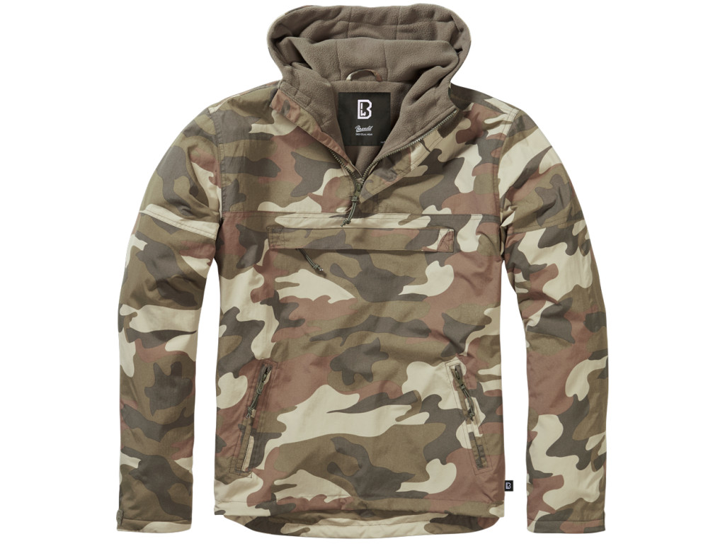 Pro uložení nezbytností je k dispozici velká náprsní kapsa na zip a dvě šikmé boční kapsy. Kapuce je vybavena stahovacími šňůrkami a u krku je zajištěna mini-zipem se suchým zipem. Tato bunda od značky Brandit je ideální volbou pro deštivé dny a nepříznivé počasí.