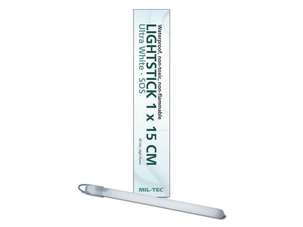 Bezpečnostní svítící chemická tyčinka, tzv. light stick s intenzivním bílým světlem. Voděodolné.