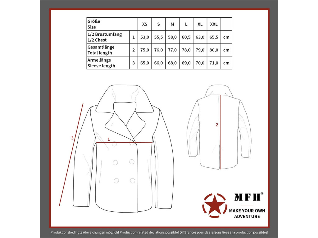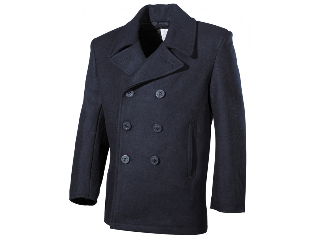Klasický námořnický kabát Pea Coat od MFH v tmavě modré barvě, vyrobený z vlněné směsi. Je ideální pro chladné počasí, skvěle se hodí jak k formálnímu, tak k ležérnímu oblečení a je synonymem pro trvanlivost a vkus. Zapínání na dvě řady modrých knoflíků s vyraženými kotvičkami.