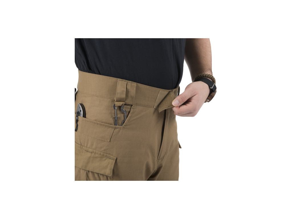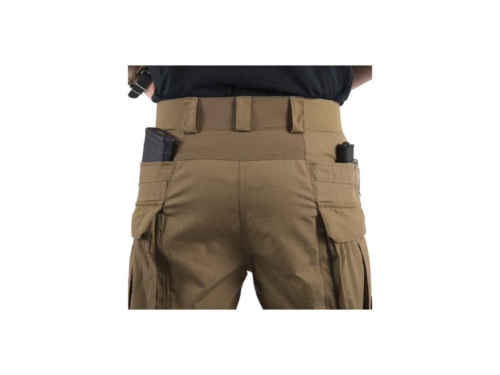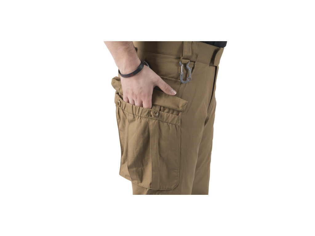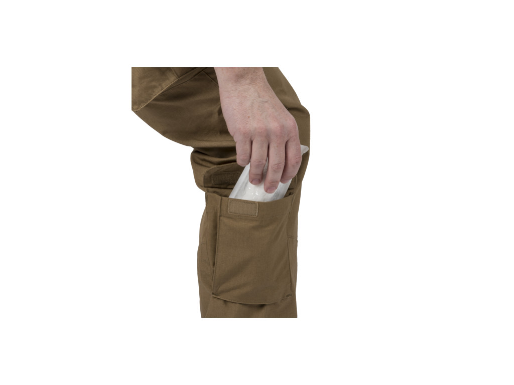 Kalhoty MBDU® jsou součástí naší modernizované polní uniformy Modern Battle Dress Uniform®. Tato uniforma byla vyrobena ze špičkových tkanin, pečlivě vybraných tak, aby poskytovaly vysokou odolnost i volnost pohybu, která je na bojišti nanejvýš důležitá. Kalhoty mají volný, profilovaný střih. Pas se zapíná pomocí suchého zipu, který umožňuje dodatečné nastavení. Široká poutka na opasek udrží opasek široký až 50 mm, a to i s pouzdry na zásobníky. V oblasti zad a v rozkroku jsou umístěny klíny z elastické tkaniny VersaStretch® pro větší volnost pohybu. Klasické bederní kapsy mají na okrajích výztuhy, aby se nepoškodily sponami na nože. Do přídavných zadních kapes se zesílenými okraji se vejdou větší předměty, třeba zásobník. Na stehnech jsou velké, prostorné cargo kapsy na zapínání. Na dolních končetinách jsou menší kapsy uzavíratelné páskou se suchým zipem, do kterých se vejdou základní nezbytnosti.