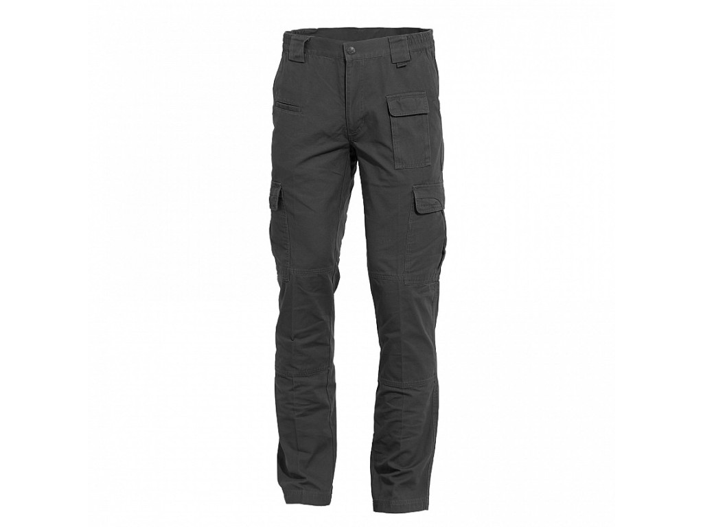 Taktické kalhoty, vyrobené z pevné bavlněné tkaniny. Látka je lehce předepraná, příjemná na dotyk, přesto velmi odolná. Střih je promyšlený, s mnoha praktickými detaily a funkčně umístěnými kapsami. Kromě základních kapes v pase a cargo kapes na stehnech, jsou kalhoty vybaveny malými kapsami v oblasti třísel, kam se hodí umístit buď pistolové zásobníky, mobil, nůž či jiné drobnější předměty. Šikovně jsou zpracované zadní kapsy se snadným vstupem, obsah je chráněn dvěma suchými zipy. Na pravé straně zadního dílu je další kapsa na zip. V pase se kalhoty zapínají kovovým zipem, drukem a ještě jedním knoflíkem. Pas je částečně pružný, s 6 cm širokými tunýlky na protažení pásku a malými tunýlky, do nichž můžete protáhnout např.karabinu na klíče. Na kolenou je látka zdvojená.