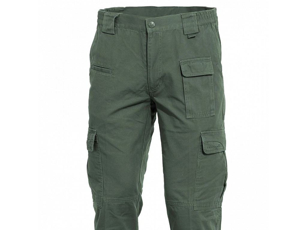 Taktické kalhoty, vyrobené z pevné bavlněné tkaniny. Látka je lehce předepraná, příjemná na dotyk, přesto velmi odolná. Střih je promyšlený, s mnoha praktickými detaily a funkčně umístěnými kapsami. Kromě základních kapes v pase a cargo kapes na stehnech, jsou kalhoty vybaveny malými kapsami v oblasti třísel, kam se hodí umístit buď pistolové zásobníky, mobil, nůž či jiné drobnější předměty. Šikovně jsou zpracované zadní kapsy se snadným vstupem, obsah je chráněn dvěma suchými zipy. Na pravé straně zadního dílu je další kapsa na zip. V pase se kalhoty zapínají kovovým zipem, drukem a ještě jedním knoflíkem. Pas je částečně pružný, s 6 cm širokými tunýlky na protažení pásku a malými tunýlky, do nichž můžete protáhnout např.karabinu na klíče. Na kolenou je látka zdvojená.