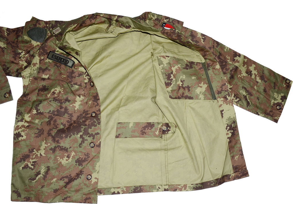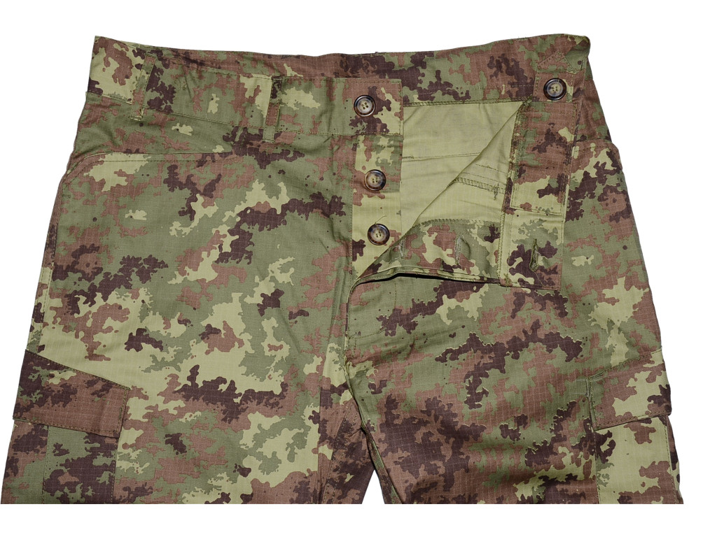 Originální polní komplet (blůza a kalhoty) používaný italskou armádou (Esercito Italiano) od roku 2004. Tento komplet v unikátním digitálním maskování Vegetato je navržen tak, aby poskytoval maximální krytí v rozmanitém terénu – od hustých lesů po suché křovinaté oblasti. Je to digitální (pixelový) maskovací vzor, který byl představen kolem roku 2004. Na rozdíl od amerického vzoru MARPAT nebo CADPAT používá specifičtější tvary skvrn, které lépe imitují středomořskou vegetaci (suché křoviny, jehličnaté i listnaté lesy). Mezi military nadšenci je ceněn nejen pro svou maskovací efektivitu, která překonává běžné NATO vzory, ale také pro svou mechanickou odolnost a typický italský styl s důrazem na detail. Z výstroje italských ozbrojených sil, včetně hodnostních hvězd na límci, originální nášivky na hrudi Esercito. Moderní čtyřbarevný digitální potisk, který skvěle rozbíjí siluetu postavy v evropské vegetaci. Praktické rozložení kapes, blůza i kalhoty disponují velkým množstvím objemných kapes se zapínáním na knoflíky pro snadný přístup k vybavení. Blůza disponuje strategicky umístěnou vnitřní kapsou se svislým vstupem pro bezpečné uložení dokladů a cenností přímo u těla. Vnitřní stahování v pase blůzy umožňuje přizpůsobit střih postavě, čímž se zvyšuje tepelný komfort a volnost pohybu. Zdvojený materiál v namáhaných oblastech (lokty a kolena) pro prodloužení životnosti v terénu. Vhodné pro airsoft, paintball, bushcraft, rybaření nebo jako extrémně odolný pracovní oděv pro venkovní aktivity.