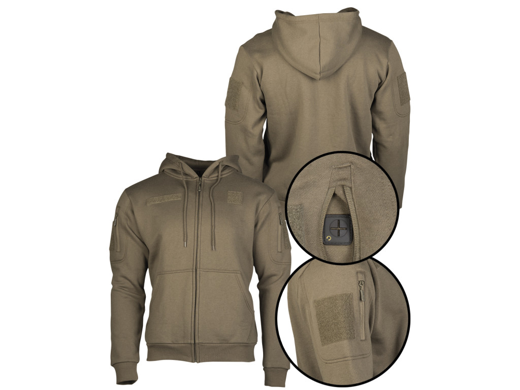 Pohodlná sportovní mikina se zapínáním na zip a velcro panely pro nášivky na zadní straně se suchým zipem. Vnitřní strana z příjemného měkkého a hřejivého materiálu.