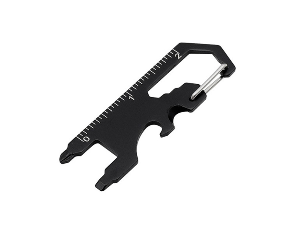 - Kroužek na klíče, integrovaná karabina, klíč, otvírák na lahve, mini páčidlo/plochý šroubovák, křížový šroubovák a malé pravítko na měření plánů a map.
