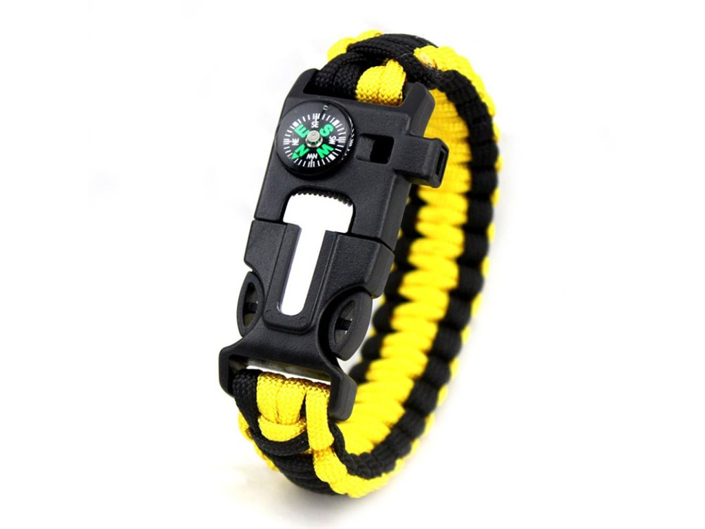 Outdoorový náramek z odolného lana, který kromě pevné padákové šňůry pro přežití obsahuje také mini kompas, píšťalku a křesadlo se škrtátkem. Náramek lze v případě nouze rozplést a získat tak kus pevné padákové šňůry pro nejrůznější účely v přírodě. Po rozpletení náramku získáte padákovou šňůru o délce přibližně 3,4 metru. Žlutočerná barevná kombinace zajišťuje dobrou viditelnost.