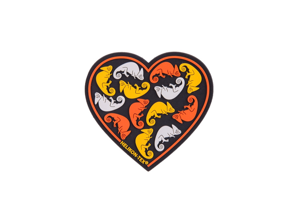 Plastová nášivka se suchým zipem na zadní straně. 3D provedení, tvar srdce, uvnitř kterého jsou chameleoni - znak výrobce taktického vybavení, firmy Helikon-Tex.