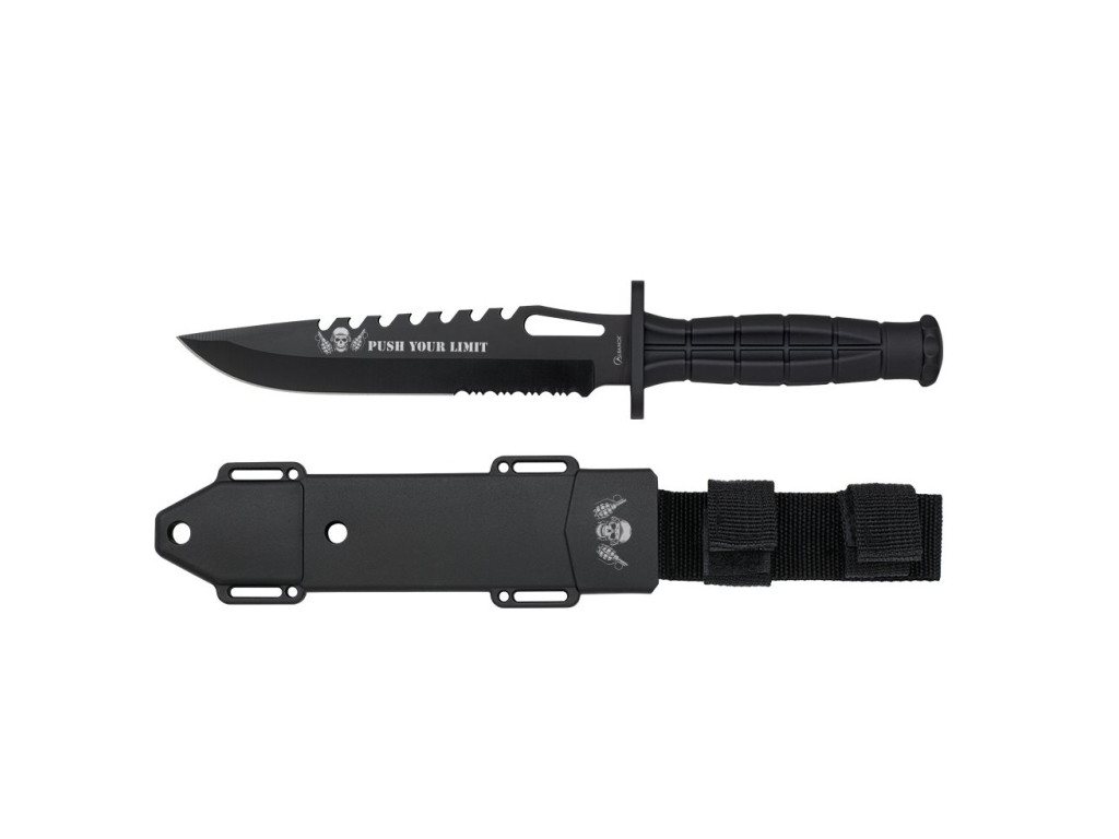 Agresivný nůž s pevnou čepelí. Čepel má kombinované ostří (částečně zoubkované), další výrazné zoubkování je na jejím hřbetu. Na čepeli nápis Push Your Limit (posuň svůj limit) a vyobrazní lebky a granátů. Součástí balení je černé plastové pouzdro, které můžete zavěsit na opasek, nebo, díky otvorům na okraji plastové části, zavěsit či přivázat, kam bude potřeba.