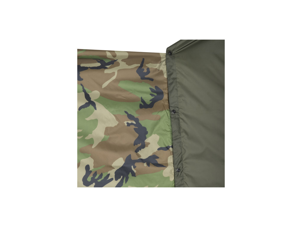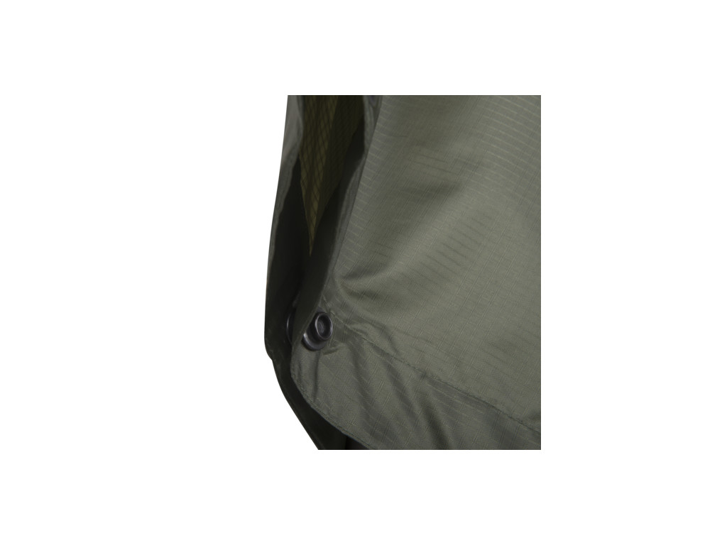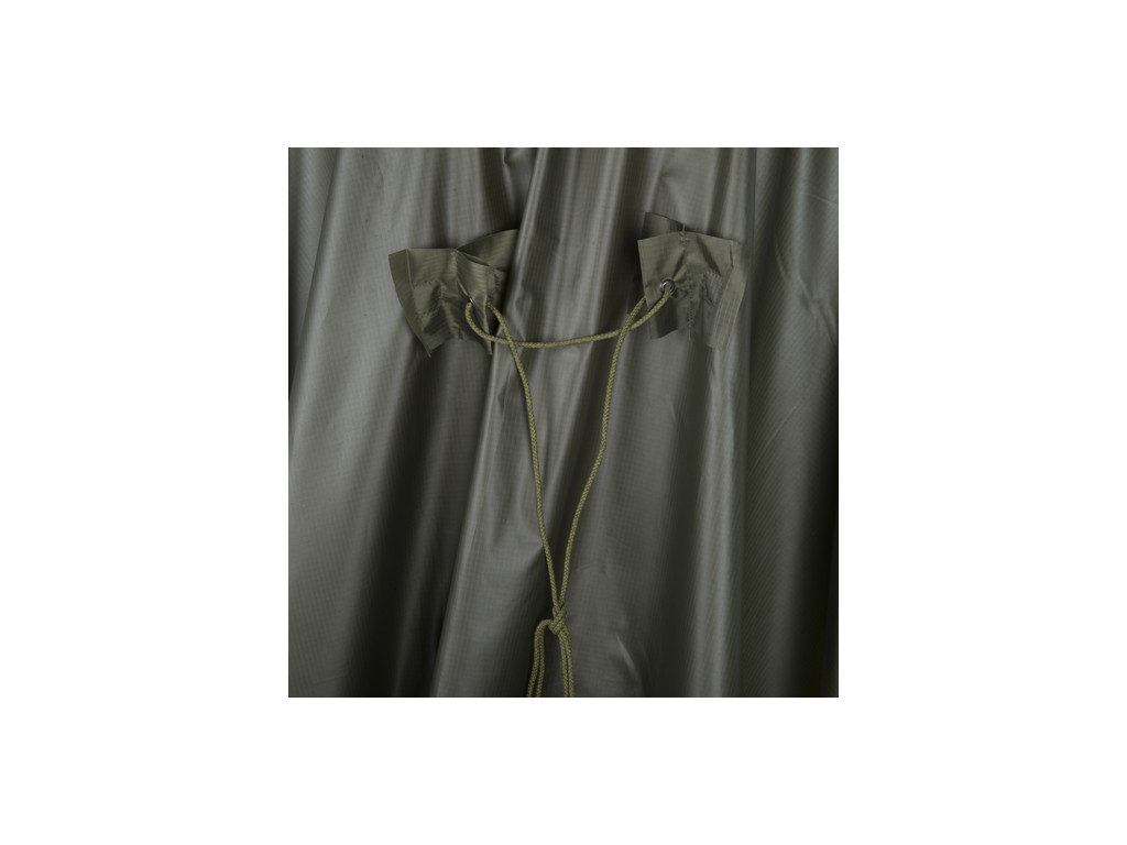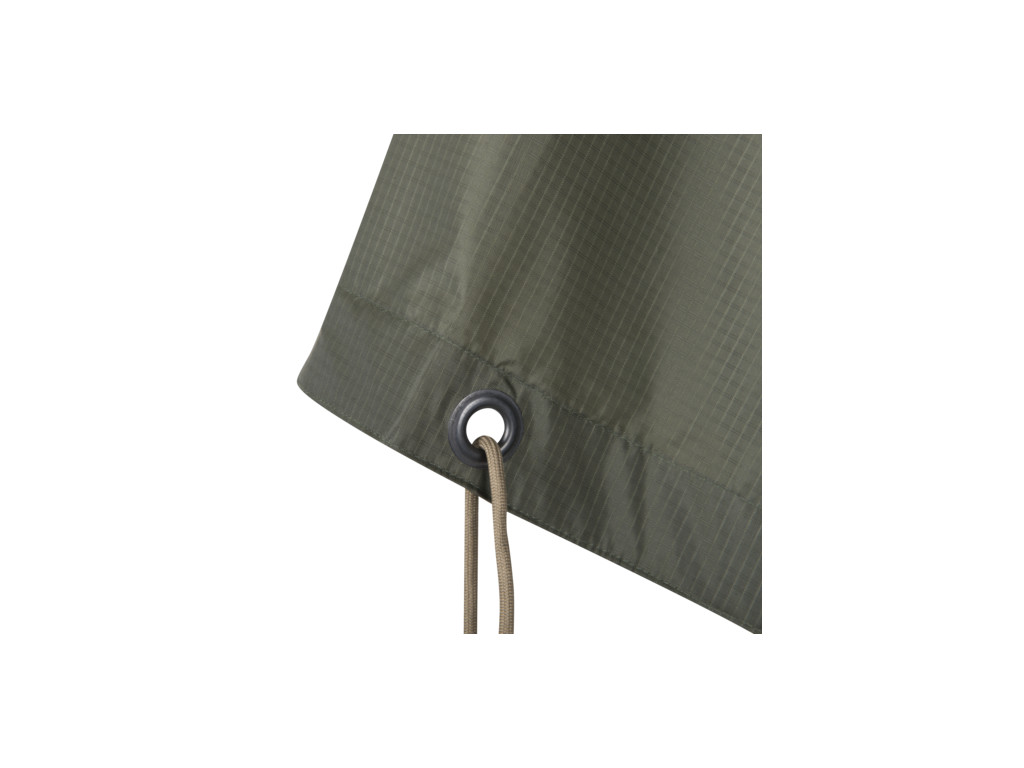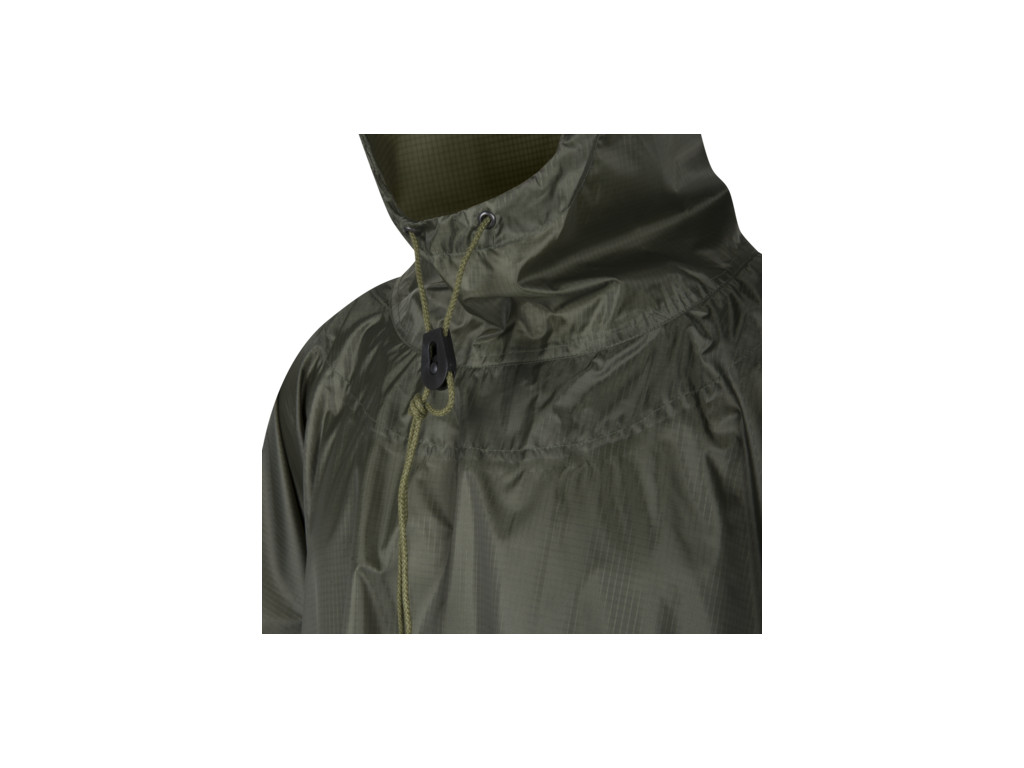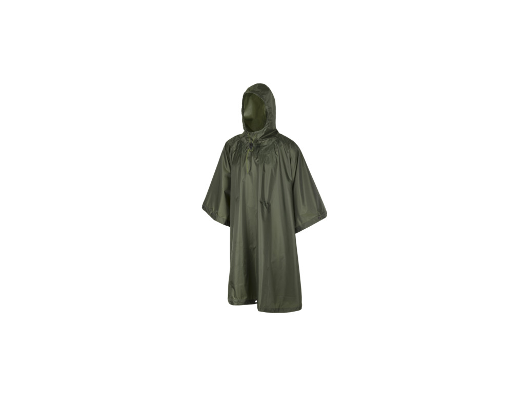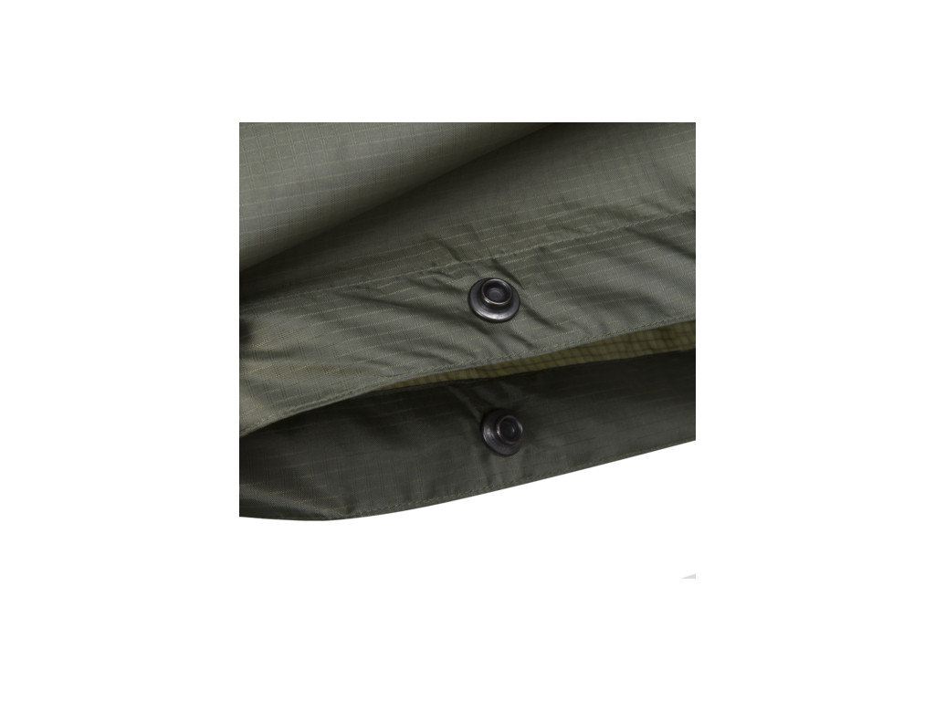 Dešti odolné poncho Helikon s Rip-Stop úpravou. Ocelové druky umožňují ponchu vytvořit rukávy, nebo spojit dva kusy dohromady a vytvořit tak provizorní a prostorný přístřešek.