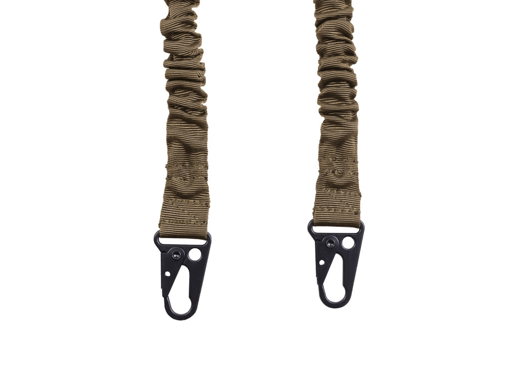 Dvoubodový nastavitelný popruh na zbraň s elastickými sekcemi. Připínání zbraně pomocí dvou kovových karabin.