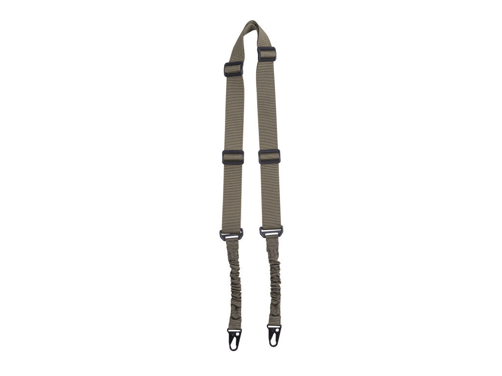 Dvoubodový nastavitelný popruh na zbraň s elastickými sekcemi. Připínání zbraně pomocí dvou kovových karabin.