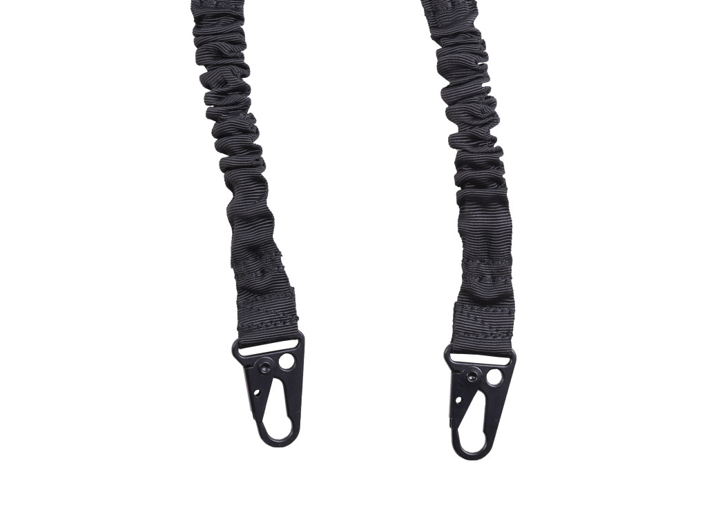 Dvoubodový nastavitelný popruh na zbraň s elastickými sekcemi. Připínání zbraně pomocí dvou kovových karabin.