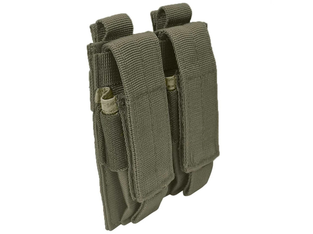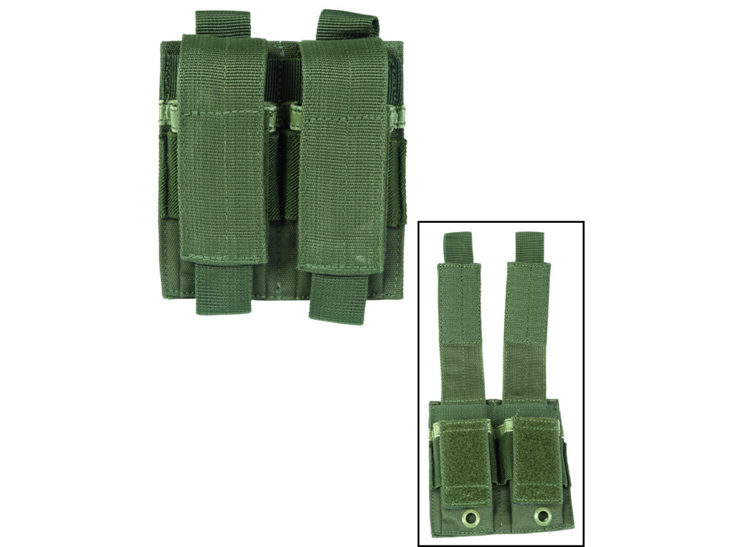 Pouzdro pro nošení dvou pistolových zásobníků je vybaveno MOLLE upevňovacím systémem, který umožňuje snadné a bezpečné připevnění na taktické vesty, opasky nebo batohy. Pro případ průniku vody je sumka opatřena odvodňovacím otvorem, který zabraňuje hromadění vlhkosti. Rychle zapínání na suchý zip.