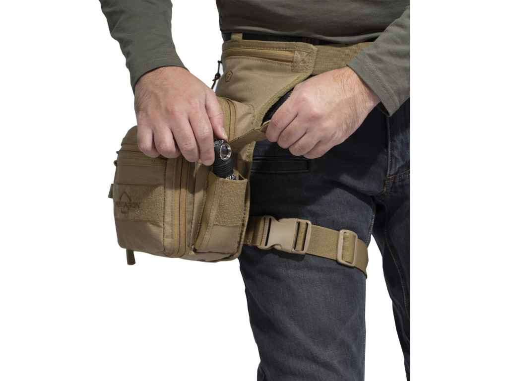 Stehenní pouzdro MAX-S 2.0 na skryté přenášení zbraně a vybavení od řeckého výrobce PENTAGON. Pouzdro je ke stehnu fixováno pomocí dvou nastavitelných širokých pásků zapínaných FASTEX přezkami. Na boku pouzdra naleznete dvě sumky na zásobníky uzavírané pomocí chlopní na suchý zip. Pouzdro je dělené na dvě části. Přední část je opatřena VELCRO panelem na nášivky, malou plochou kapsou uzavíranou zipem, vnitřní síťovanou kapsou, dvěma řadami MOLLE/PALS vazby a malou plastovou karabinkou. Zadní kapsa je prostorná, pojme zbraň kompaktní velikosti či dva puškové zásobníky. Poslední kapsu naleznete v horní části pouzdra, ta je vhodná na uložení cenností jako jsou peníze či doklady, případně do ní můžete vložit zbraň služební velikosti.