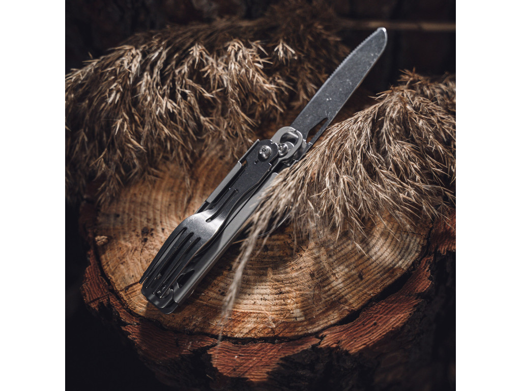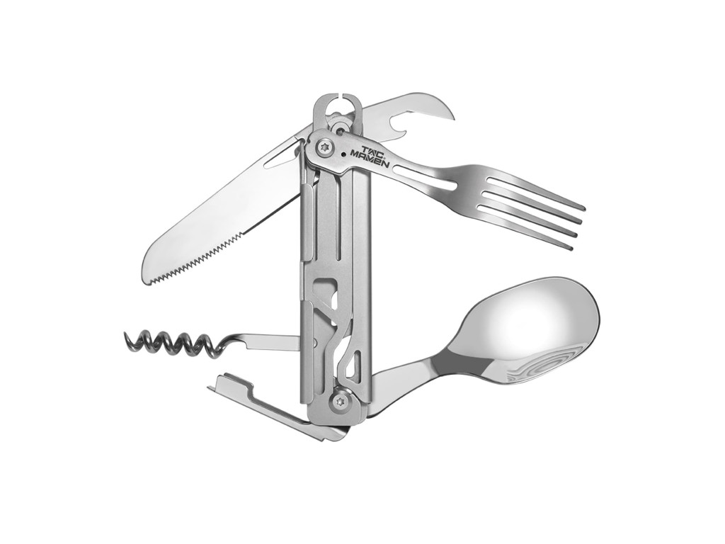 nabízí tento multifunkční nástroj řadu praktických funkcí, včetně čepele, lžíce, vidličky, otvíráku na láhve, otvíráku na konzervy a vývrtky.