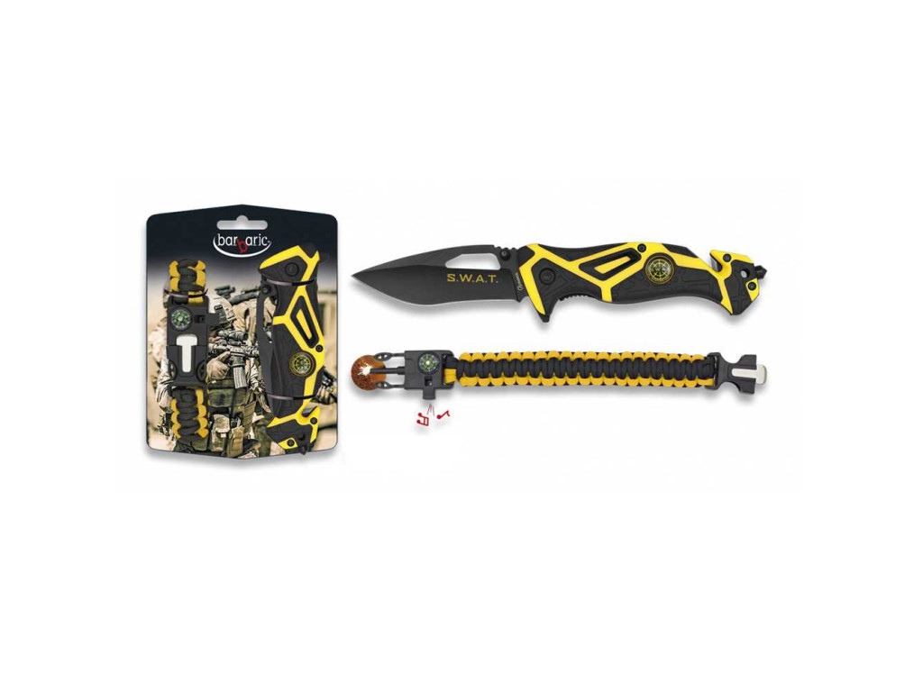 Sada nože a náramku, barevně sladěná. Paracordový náramek má integrovaný mini kompas, píšťalku a stírací křesadlo. Nůž se zavírá na patentku a má klip na opasek, řezač bezpečnostních pásů a hrot na rozbíjení skla. Popis S.W.A.T. je uveden na čepeli. Otevírání nože pomocí „FOS“ - rychlého otevíracího systému jedním stiskem prstu a čepel díky předpětí vyskočí do otevřené polohy. Rukojeť je potažena měkkou gumou s efektním reliéfem. Je to nůž pro všechno. Do lesa, na turistiku, jako záložní nůž vždy po ruce, na chatu, k vodě, do auta atd. Paracordový náramek je vyrobený z pevného nylonu a disponuje kompasem, píšťalkou a nouzovým křesadlem.