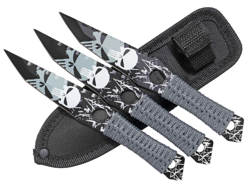 Sada tří menších vrhacích nožů od firmy Albainox, čepel s potiskem lebek a nylonový oplet rukojeti. Nože jsou vyrobeny z houževnaté nerezové oceli 3Cr13MoV. Součástí dodávky je společné černé nylonové pouzdro s průvlekem na opasek. Vrhání nožů je zábava pro celou rodinu a u dětí navíc rozvíjí motoriku a koordinaci ruka - oko.
