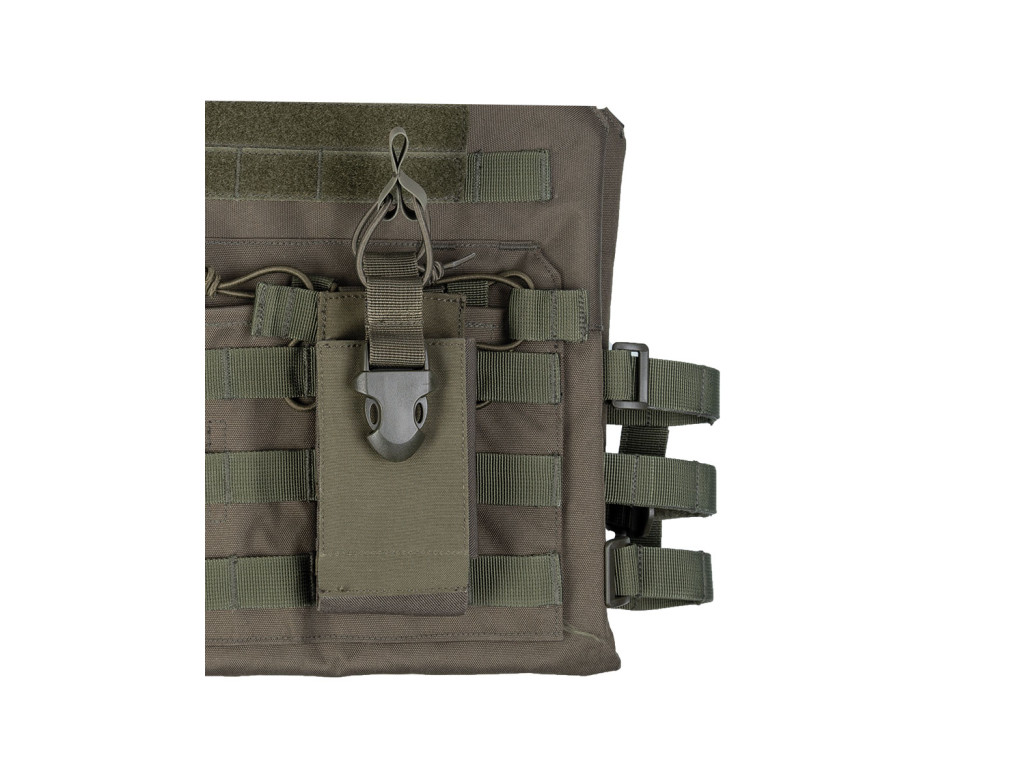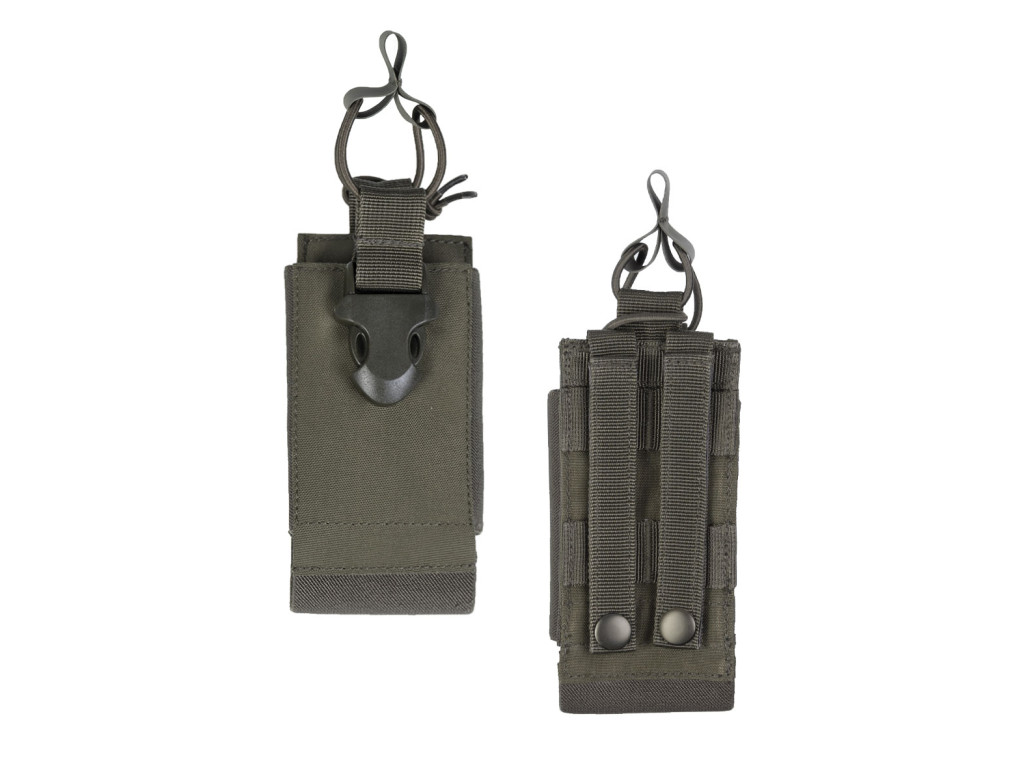 Elastické pouzdro na rádio. Je vyrobené ze 100% polyesteru (Oxford) a díky elastickým bokům umožňuje vložení celé řady modelů rádií. Přístroj můžete zafixovat pomocí horní pruženky, která lze v případě potřeby rychle rozepnout pomocí plastové přezky. Na zádech pouzdra se nachází modulární systém kompatibilní s vazbou standardu MOLLE/PALS.