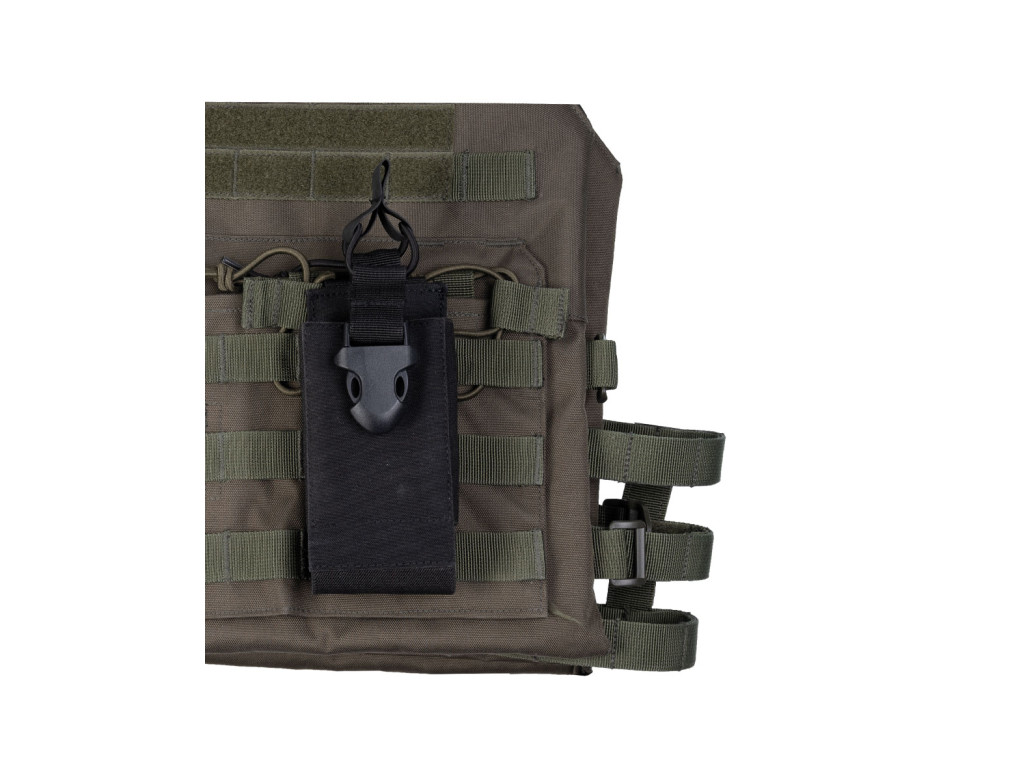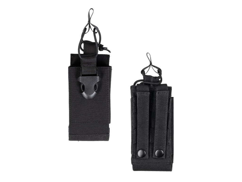 Elastické pouzdro na rádio. Je vyrobené ze 100% polyesteru (Oxford) a díky elastickým bokům umožňuje vložení celé řady modelů rádií. Přístroj můžete zafixovat pomocí horní pruženky, která lze v případě potřeby rychle rozepnout pomocí plastové přezky. Na zádech pouzdra se nachází modulární systém kompatibilní s vazbou standardu MOLLE/PALS.