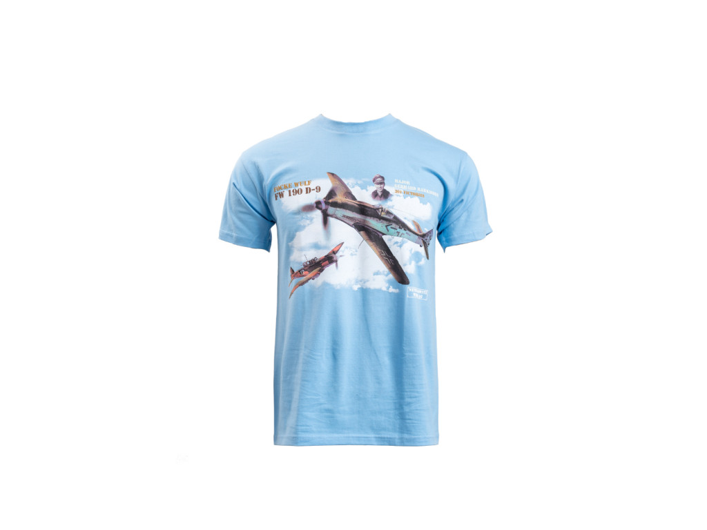 Světle modré triko s potiskem stíhačky F190. Rozměr potisku 35 x 25 cm. Klasický střih t-shirt.