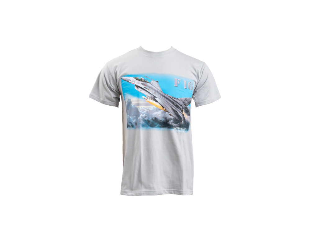 Světle šedé triko s potiskem stíhačky F16. Rozměr potisku 34 x 24 cm. Klasický střih t-shirt.