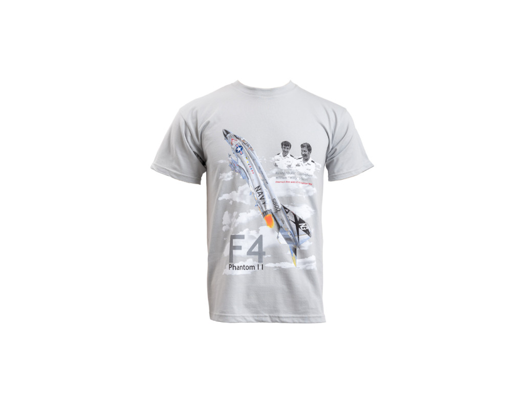 Světle šedé triko s potiskem stíhačky Phantom II F4. Rozměr potisku 30 x 38 cm. Klasický střih t-shirt.
