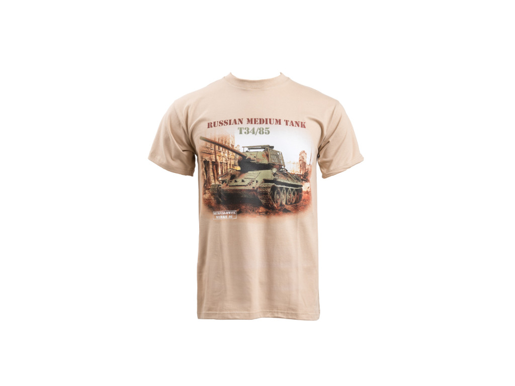 Béžové triko s potiskem stíhačky T34/85. Rozměr potisku 34 x 26 cm. Klasický střih t-shirt.